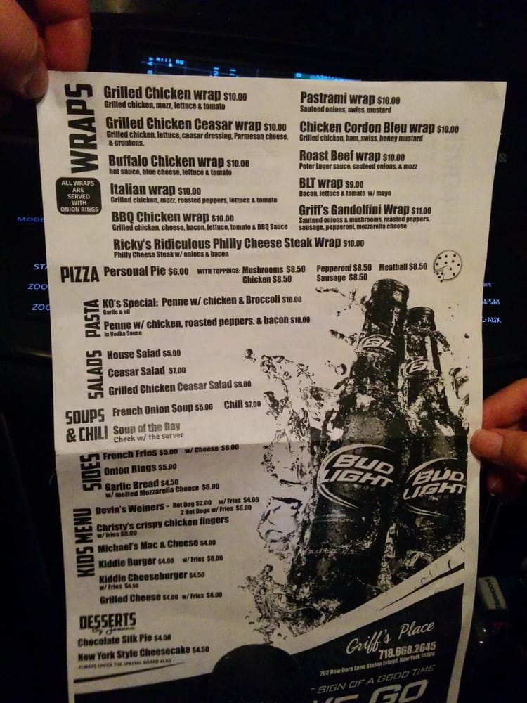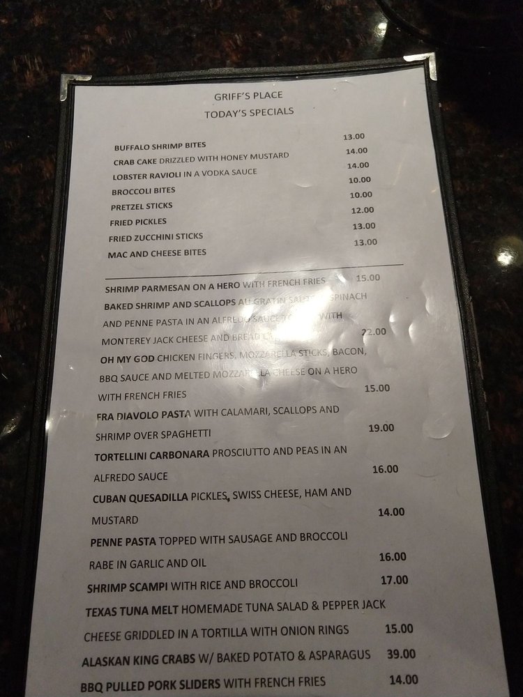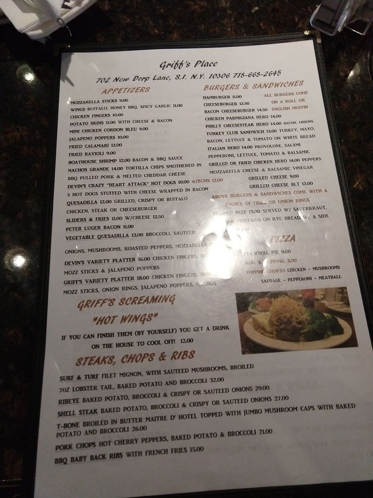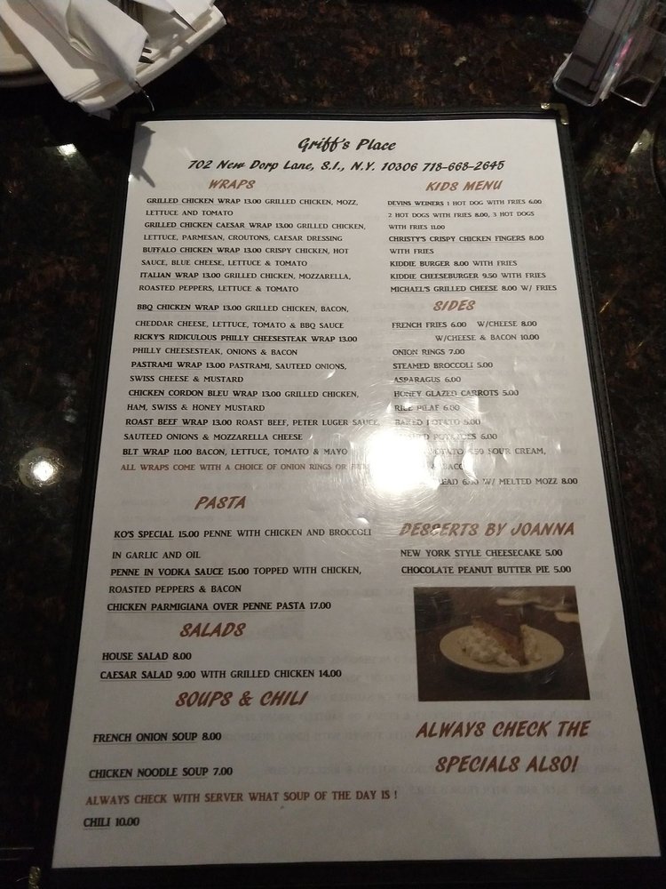 Welcome to Griff's Place, a hidden gem located at 702 New Dorp Ln, Staten Island. This American dessert haven is not just about sweets; it boasts a diverse menu that caters to every palate. From hearty appetizers like Potato Skins with Cheese & Bacon to comforting soups such as French Onion Soup, each dish promises quality and flavor.